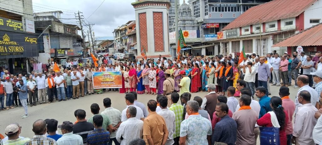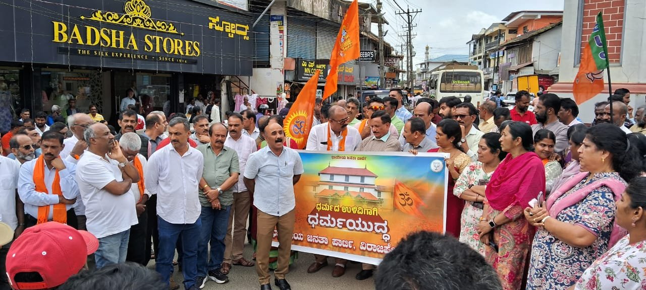 ಭಾರತೀಯ ಜನತಾ ಪಕ್ಷ ವಿರಾಜಪೇಟೆ ಮಂಡಲದ ವತಿಯಿಂದ ನಗರದ ಗಡಿಯಾರ ಕಂಬದ ಬಳಿ ಧರ್ಮದ ಉಳಿವಿಗಾಗಿ ಧರ್ಮಯುದ್ದ ಎಂಬ ಘೋಷವಾಖ್ಯದಡಿಯಲ್ಲಿ ಧರ್ಮಸ್ಥಳ ಪ್ರಕರಣವನ್ನು ಖಂಡಿಸಿ ಬೃಹತ್ ಪ್ರತಿಭಟನೆ ನಡೆಸಿದವು. ಮಾನವ ಸರಪಳಿಯ ಮೂಲಕ ಪ್ರಕರಣದ ರೂವಾರಿಗಳ ಮತ್ತು ಸರ್ಕಾರದ ವಿರುದ್ದ ಘೋಷಣೆಗಳನ್ನು ಕೂಗಿ ತಮ್ಮ ಖಂಡನೆಯನ್ನು ಹೊರಹಾಕಿದರು. ಪ್ರತಿಭಟನೆಯನ್ನು ಉದ್ದೇಶಿಸಿ ಮಾತನಾಡಿದ ಕೊಡಗು ಮೈಸೂರು ಸಂಸದರಾದ ಯದುವೀರ ಕೃಷ್ಣದತ್ತ ಚಾಮರಾಜ ಒಡೆಯರ್ ಅವರು ಮಾತನಾಡಿ ಹಿಂದೂಗಳ ಭಾವನೆಗಳಿಗೆ ಧಕ್ಕೆಯಾಗುವಂತೆ ಷಡ್ಯಂತ್ರ ರಚಿಸಿ ಧಾರ್ಮಿಕ ಕೇಂದ್ರಗಳನ್ನು ಗುರಿಯಾಗಿಸಿಕೊಂಡು ಅಪಮಾನ ಮಾಡುವ ರೀತಿಯಲ್ಲಿ ಕಾಣದ ಕೈಗಳು ಪ್ರತಿನಿಧಿಸುತ್ತಿದೆ. ಶ್ರದ್ದಾ ಕೇಂದ್ರಗಳ ಬಗ್ಗೆ ಅಪಪ್ರಚಾರ ಮಾಡಿರುವ ವ್ಯಕ್ತಿಗಳ ವಿರುದ್ದ ನಿರ್ಧಾಕ್ಷಿಣ್ಯ ಕ್ರಮ ಜರುಗಿಸಬೇಕು ಎಂದು ಒತ್ತಾಯ ಮಾಡುತ್ತೇನೆ. ಧರ್ಮ ಕೇಂದ್ರಗಳ ಮೇಲೆ ಅಪಪ್ರಚಾರಗಳು ನಡೆಯುವ ಸಂಧರ್ಭದಲ್ಲಿ ಎಲ್ಲಾ ಹಿಂದೂ ಬಾಂದವರು ಒಂದಾಗಿ ಹೋರಾಟಕ್ಕೆ ಸಿದ್ದರಾಗ ಬೇಕು. ಧರ್ಮಕೇಂದ್ರಗಳ ಉಳಿವಿಗಾಗಿ ಸ್ಥಿರ ನೆಲೆಗಾಗಿ ಹೋರಾಟಗಳು ಮುಖ್ಯ ಎಂದರು. ಅಪಪ್ರಚಾರದಲ್ಲಿ ಅಂತರ್ ರಾಜ್ಯಗಳ ಕೈವಾಡವಿದೆ ಎಂಬ ಸಂಶಯ ವ್ಯಕ್ತವಾಗುತ್ತಿವೆ.ಈ ಹಿನ್ನಲೆಯಲ್ಲಿ ಎಸ್,ಐ.ಟಿ. ತನಿಖಾ ಸಂಸ್ಥೆಯು ಪಾರದರ್ಶಕವಾಗಿ ತನ್ನ ತನಿಖೆಯನ್ನು ಪೂರ್ಣಗೊಳಿಸಿ ಸತ್ಯ ಹೊರಬರುವಂತೆ ತನಿಖೆ ನಡೆಸುತ್ತದೆ ಎಂಬ ಧೃಡ ವಿಶ್ವಾಸ ನಮಗಿದೆ ಎಂದು ಹೇಳಿದರು.