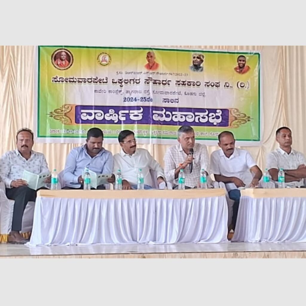 ಜನವಾಹಿನಿ NEWS ಸೋಮವಾರಪೇಟೆ : ಇಲ್ಲಿನ ಒಕ್ಕಲಿಗರ ಸೌಹಾರ್ಧ ಸಹಕಾರಿ ಸಂಘದ ೨೦೨೪-೨೫ನೇ ಸಾಲಿನ ವಾರ್ಷಿಕ ಮಹಾಸಭೆ ಸಮೀಪದ ಒಕ್ಕಲಿಗರ ಸಮುದಾಯ ಭವನದಲ್ಲಿ ಸಂಘದ ಅಧ್ಯಕ್ಷ ಬಿ.ಜೆ.ದೀಪಕ್ ಅವರ ನೇತೃತ್ವದ ಶನಿವಾರ ನಡೆಯಿತು.