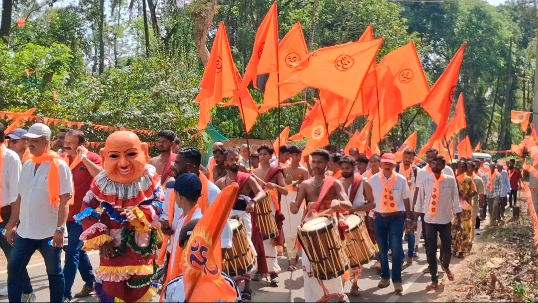 ಶೋಭಾಯಾತ್ರೆಯಲ್ಲಿ ಕೇಸರಿ ಶಲ್ಯ ಧರಿಸಿ ಬಾವುಟ ಹಿಡಿದು ಮೆರವಣಿಗೆ ಸಾಗಿದ ಹಿಂದೂ ಬಾಂಧವರು